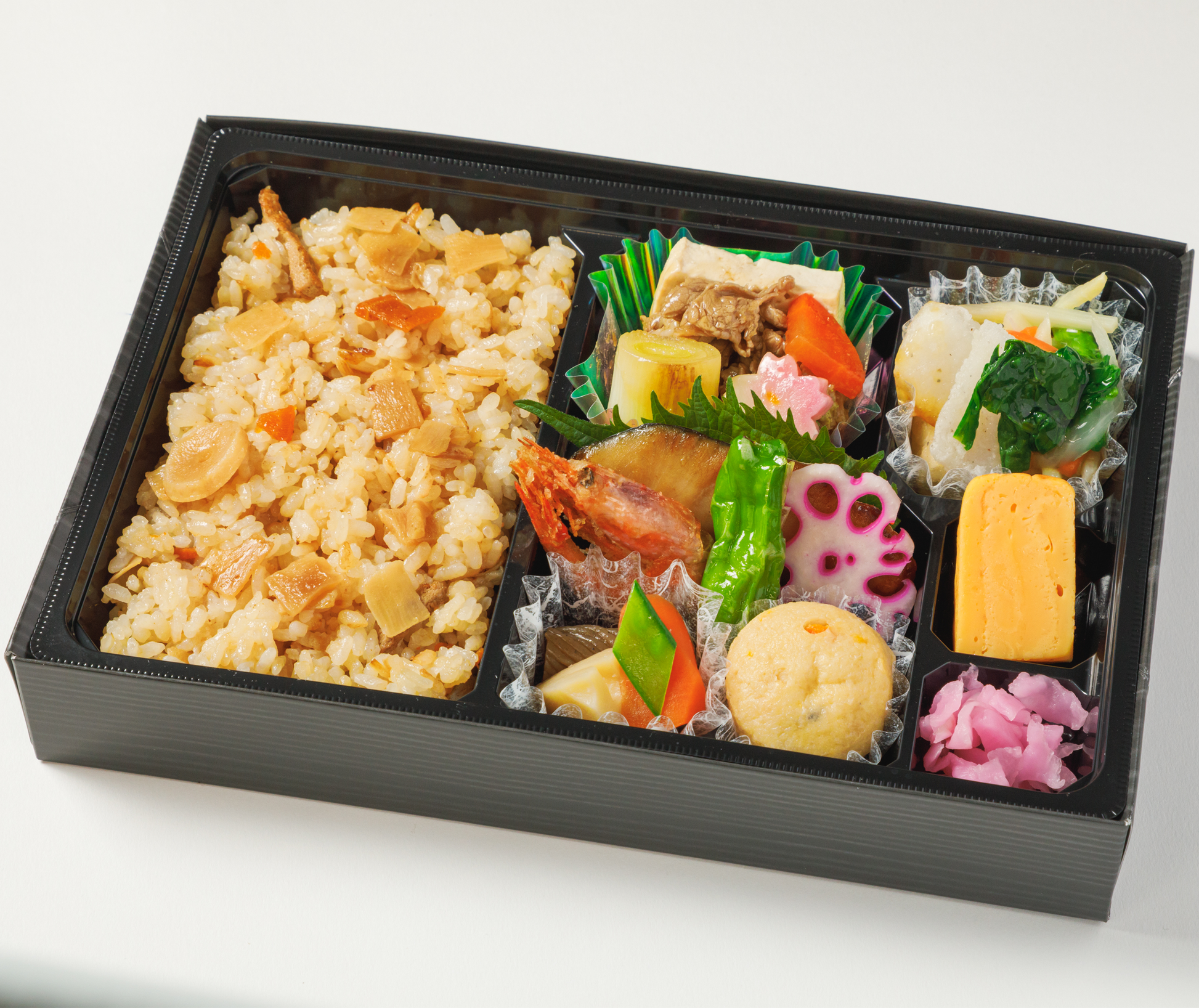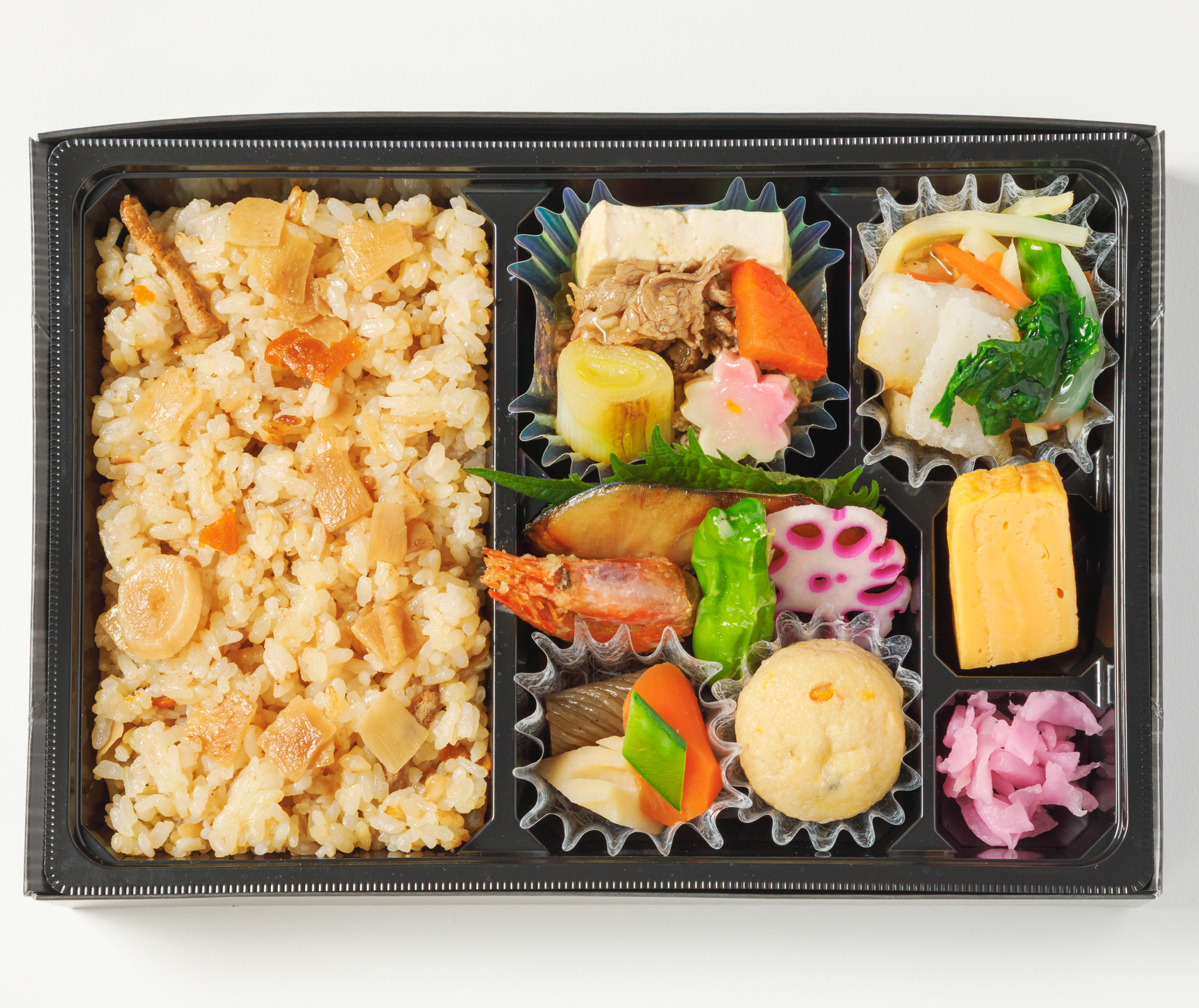 すき焼き、カレイと豆腐の春野菜餡かけ、さわら柚庵焼き、甘えび唐揚げ、ししとう、花散らし蓮根、がんも含め煮、煮物、漬物、筍ご飯